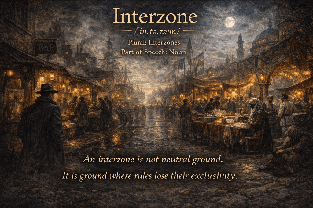 From inter- (“between”) + zone; adapted into literary usage in the 1950s.