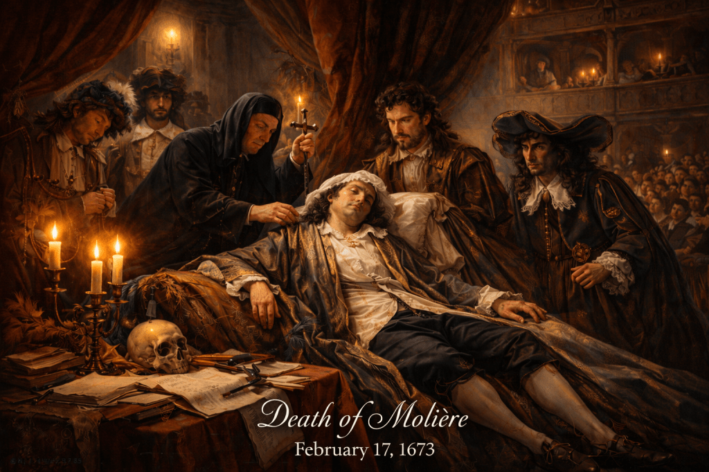 On this day — February 17, 1673, Molière died only hours after performing the title role in The Imaginary Invalid. Suffering from illness but determined to appear on stage, he collapsed during the performance and died later that night — an event that fused his legacy permanently with the theatre itself.