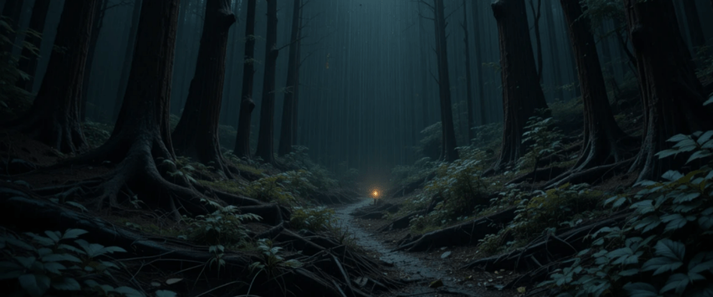En ese mismo bosque, un viajero humano se había extraviado. Mojado y cansado, vagaba sin rumbo, tropezando con raíces y ramas caídas. La tormenta había borrado el sendero, y no podía ver más allá de unos pasos. Sus ojos buscaban desesperadamente una luz que le indicara dónde refugiarse, pero la oscuridad era absoluta. El miedo y la desesperación comenzaban a apoderarse de él.
