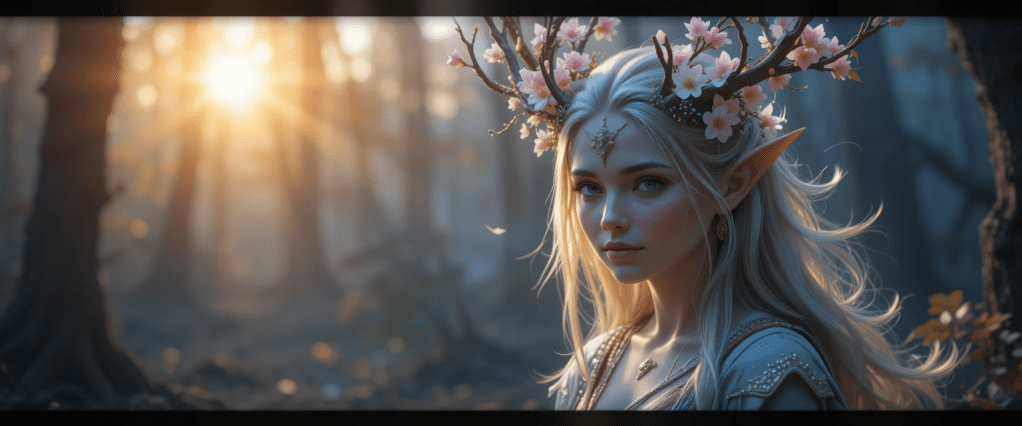 Exhausted and trembling, Elara collapsed near a quiet glade. The air grew still, and a faint, ethereal glow began to illuminate the clearing. Sylvara stepped out from the shadows, her presence both comforting and awe-inspiring.