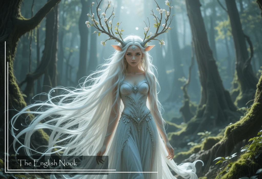 Deep within an ancient forest, where sunlight barely kissed the moss-covered ground and the trees whispered secrets to the wind, there lived a mystical being known as Sylvara. She was a guardian of the forest and a guide for lost souls, both living and departed. Her presence was otherworldly—tall and graceful, with long flowing hair that shimmered like moonlight, and antlers adorned with delicate vines and glowing blossoms. Her eyes held the wisdom of centuries, and her voice was the soft rustle of leaves in the breeze.