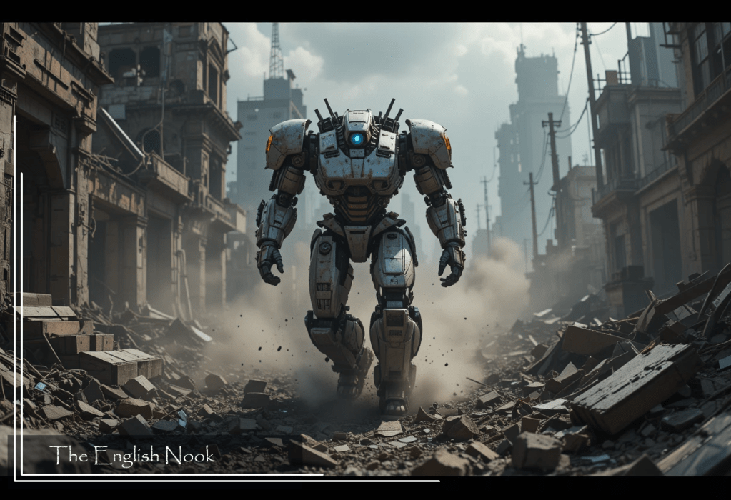 El zumbido de sus servomotores apenas se escuchaba sobre el viento que silbaba entre los restos oxidados de lo que alguna vez fue una gran ciudad. Las torres derrumbadas y los escombros esparcidos por las calles formaban un paisaje de desolación. RX-17 se tambaleaba con cada paso, sus articulaciones metálicas rechinaban por la falta de mantenimiento y su visión, una vez nítida y precisa, estaba plagada de interferencias.