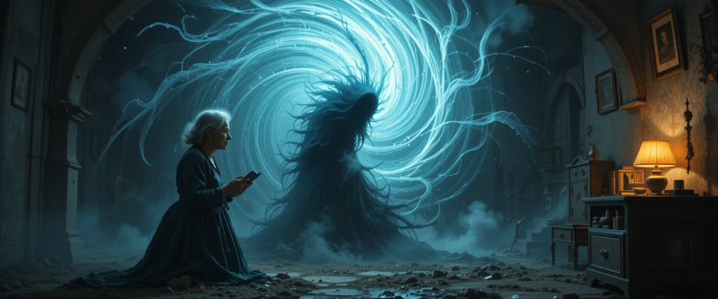 La anciana no dejó de recitar. Con cada palabra, el viento dentro de la casa se intensificaba, formando un remolino espectral que giraba alrededor del reloj. La sombra que comenzaba a emerger del suelo se retorció con furia. Gritó. Maldijo en un idioma olvidado. Pero Amelia no titubeó. Sabía que esta vez debía asegurarse de sellarlo bien… o de perderlo todo.