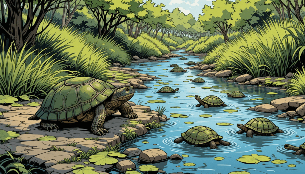 Un grupo de tortugas de agua se deslizaba por el cauce con elegancia. Nadaban como si danzaran, sumergiéndose y emergiendo con alegría. Una de ellas giró sobre sí misma mientras una rana aplaudía desde una hoja de loto. Se reían, se zambullían, salpicaban gotas que brillaban con la luz del sol.