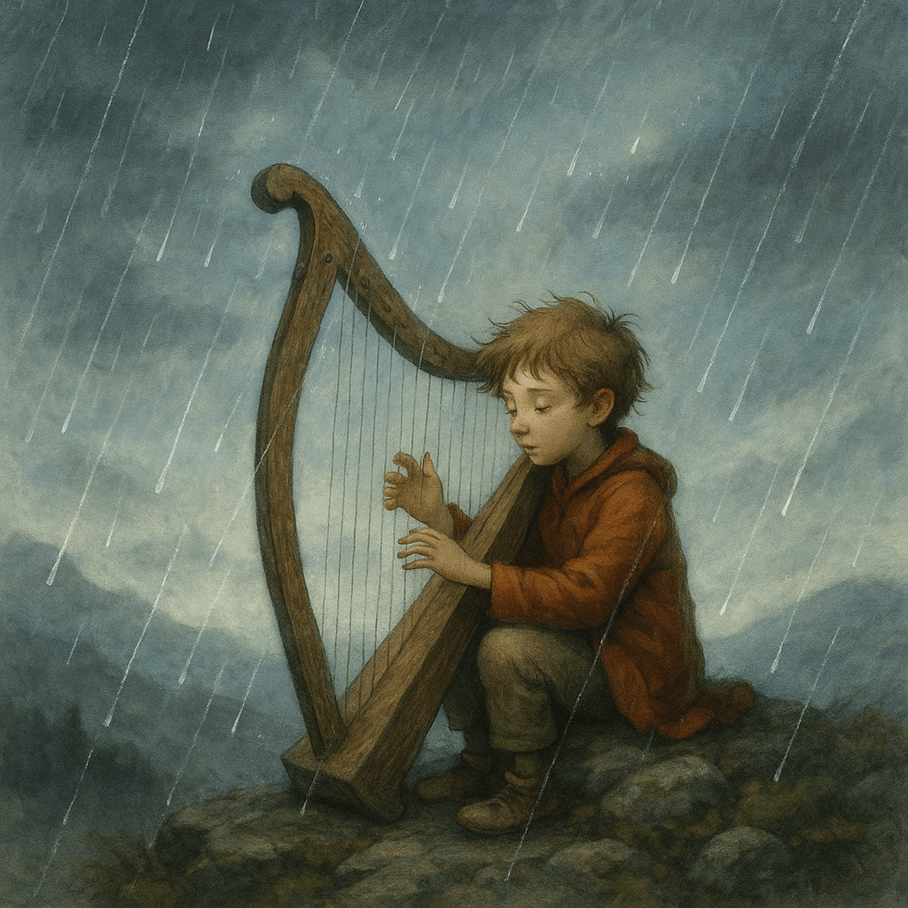 Nilo climbed for two days. He carved the harp with numb fingers and played. Softly. Patiently. With every note, he poured in his memories: laughter by empty wells, cracked earth beneath bare feet, Mistra’s warm voice.