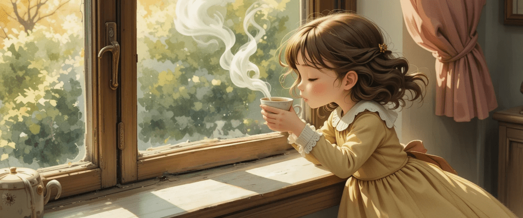 It was brewed in a dainty porcelain cup with painted bluebirds and gold along the rim. The steam rose in soft curls, and the scent — oh, the scent! — was warm and calming, like cinnamon, sunshine, and stories waiting to be told.