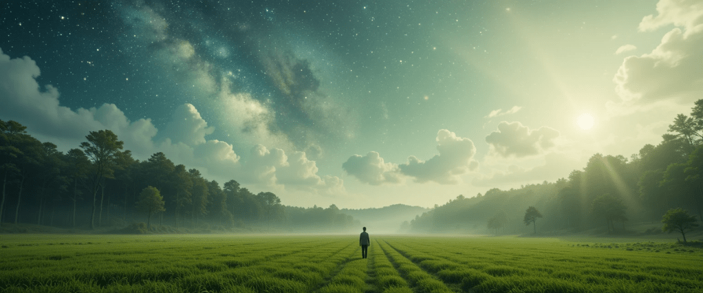 Cuando abrió los ojos, el bosque había desaparecido. Estaba en un campo verde, bajo un cielo luminoso y sereno que no pertenecía a ninguna tierra conocida, como si el universo mismo hubiera tejido un espacio sólo para él. El aire olía a nuevo comienzo, a tierra mojada tras la tormenta. No había serpiente, ni lago, ni sombras cantando. Solo él, su cuerpo, su alma… y una sensación profunda de paz, de entera pertenencia.