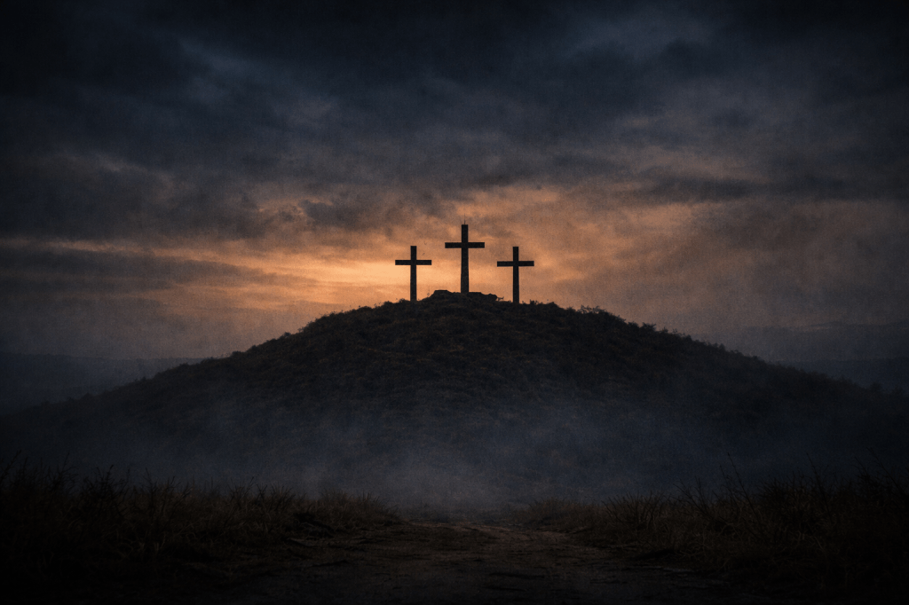 I am still standing at the edge of the road, looking at the hill and the three crosses from far away. I do not understand everything that is happening, but I know that this is not like the other times.