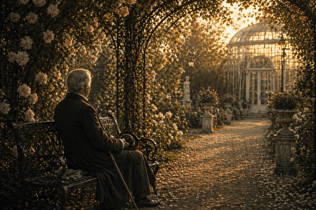 Se sentó en la banca junto al sendero central, bajo el arco donde las rosas aún no florecían, y observó cómo la luz cambiaba sobre los vidrios del invernadero. Esperó hasta que el sol descendió, hasta que el jardín cerró, hasta que el cuidador apagó una a una las lámparas del paseo.